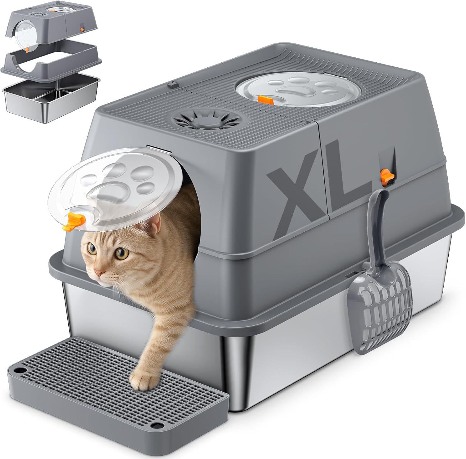 QEANY lettiera per gatti in acciaio inox XXL con coperchio 60 x 40 x 39 cm, grande e chiusa (con pala e tappetino)