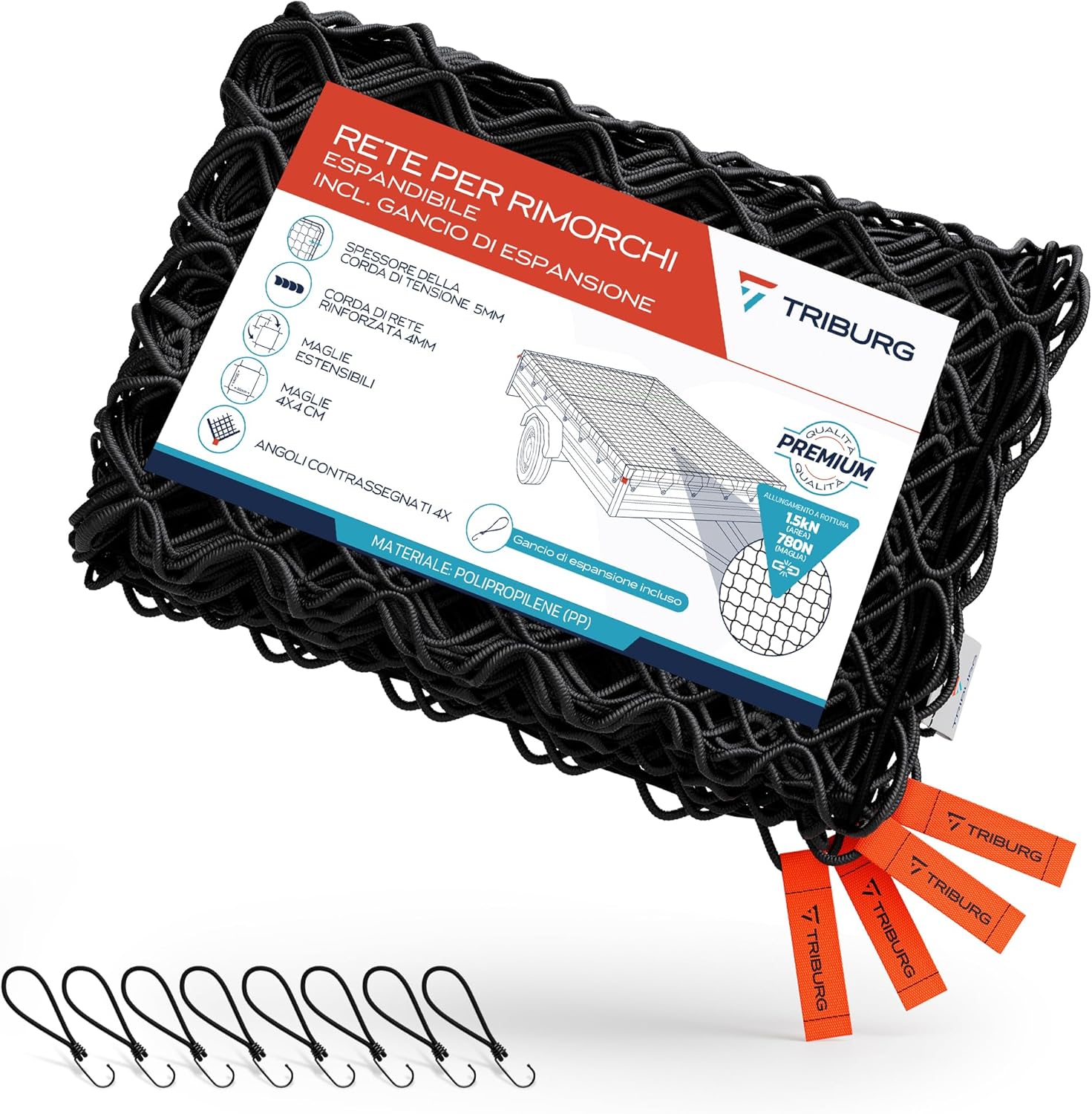 La parte che spesso fa la differenza tra una rete che sta su e una rete che si affloscia è il fissaggio. In questo caso TRIBURG include 8 ganci di espansione e 8 tenditori in gomma con ganci per un fissaggio “ottimale” del carico.