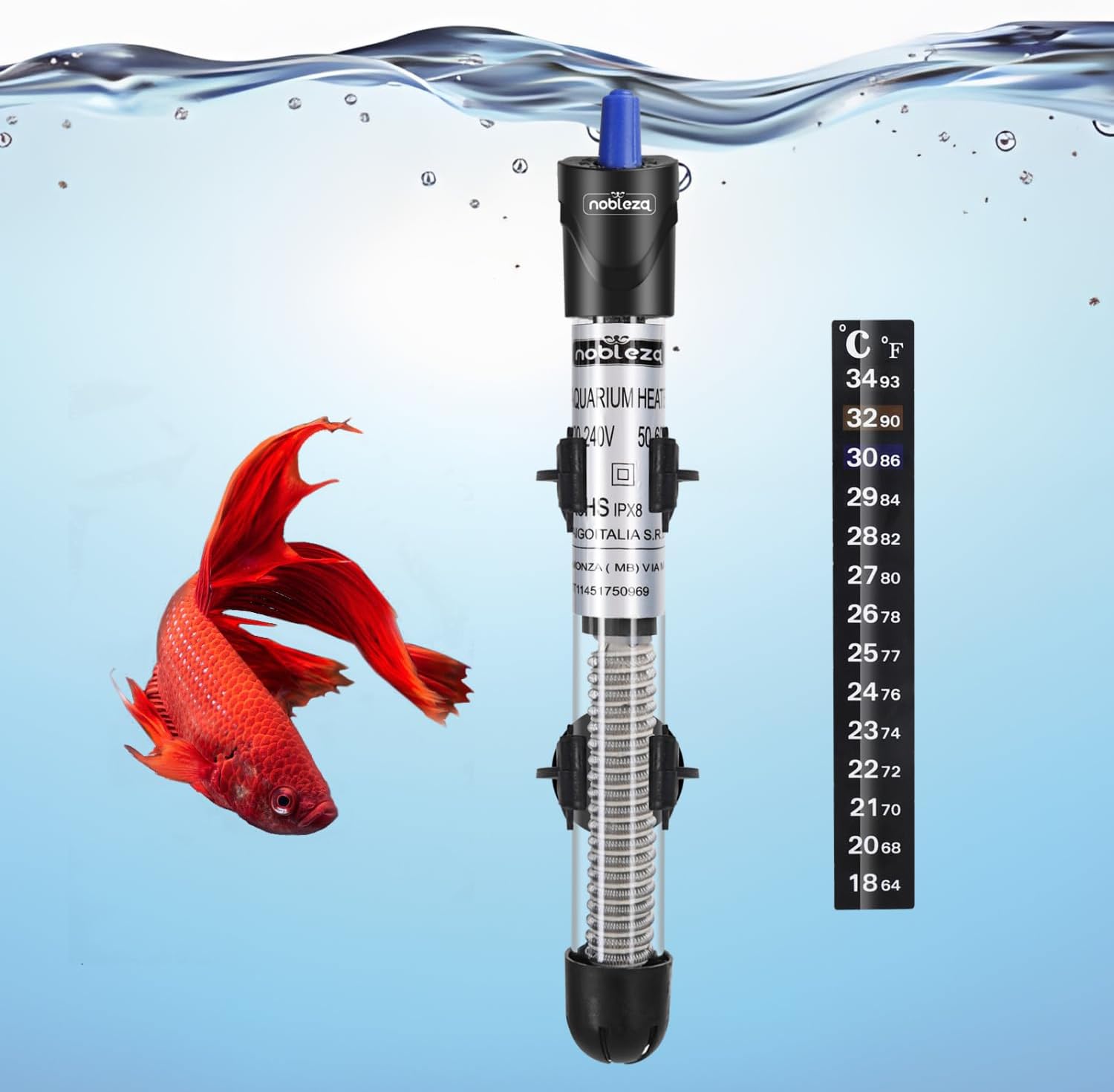 Se cerchi un riscaldatore sommergibile per un acquario 30-100L e vuoi una regolazione 18–32°C più semplice da gestire grazie a scala e indicazione/display temperatura, questo Nobleza da 100W può avere senso: non promette miracoli, ma sul progetto punta su controllo, protezione fisica (vetro di quarzo e copertura inferiore) e praticità.