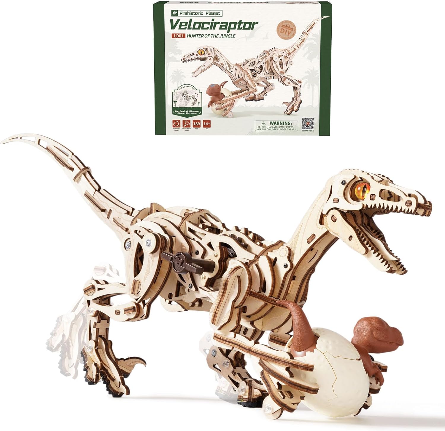 Il kit include 189 pezzi tagliati al laser e istruzioni per il montaggio, il che rende l'assemblaggio lineare ma coinvolgente. Il movimento è assicurato da un meccanismo a carica manuale con ingranaggi e collegamenti interni, quindi non servono batterie né colla. Il modello ha gambe a molla, coda dinamica e occhi in resina arancione che aggiungono un tocco realistico all'esposizione e al gioco.