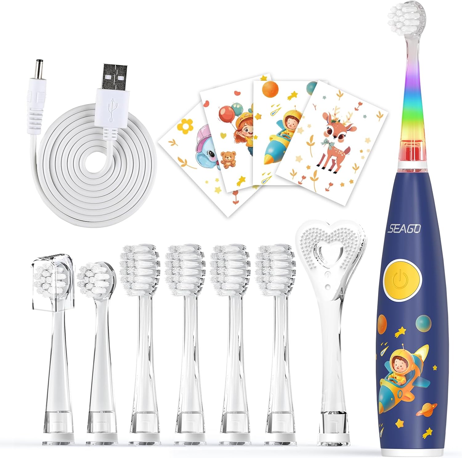 Seago SG-2159 spazzolino elettrico per bambini (0-6 anni) ricaricabile con 8 testine morbide, LED colorati e timer 2 minuti