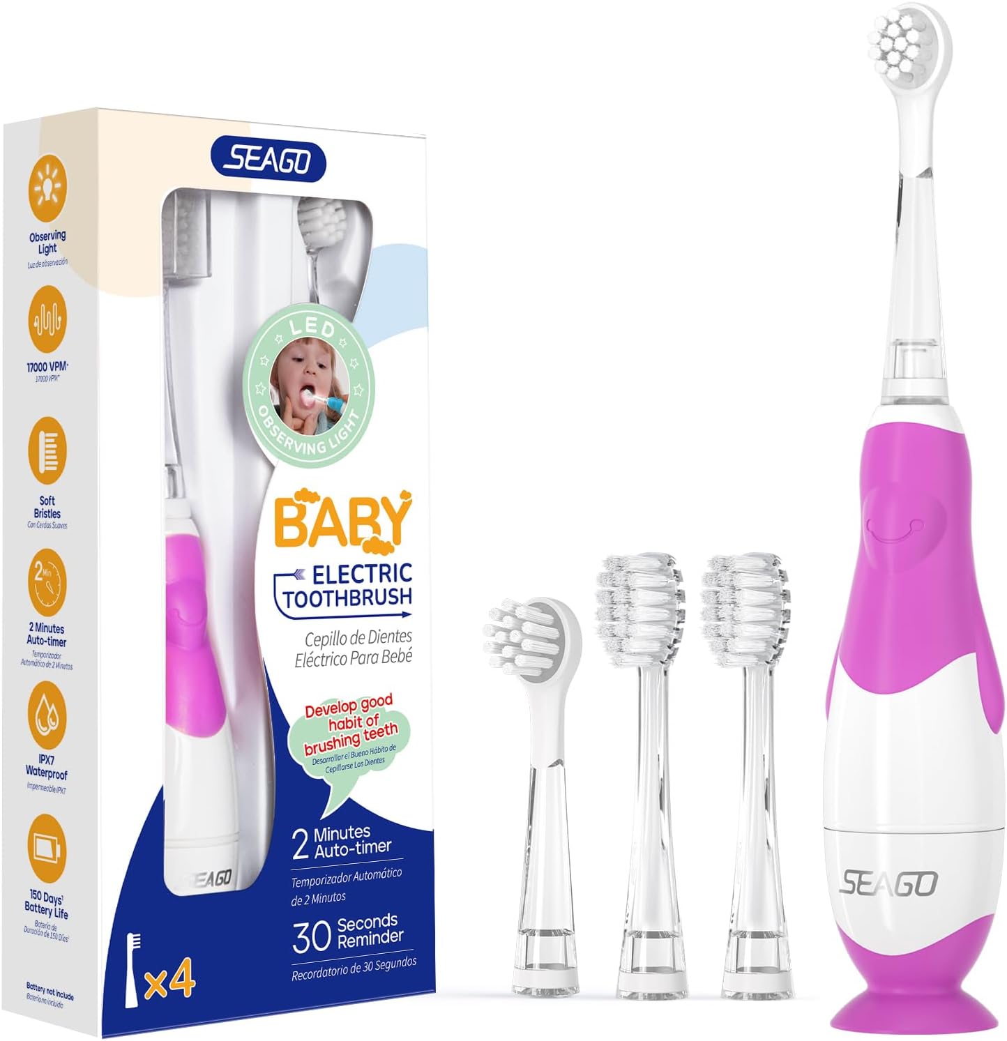 Seago spazzolino elettrico bambini con timer 2 minuti, luce LED e base aspirante (da 0 a 3 anni)