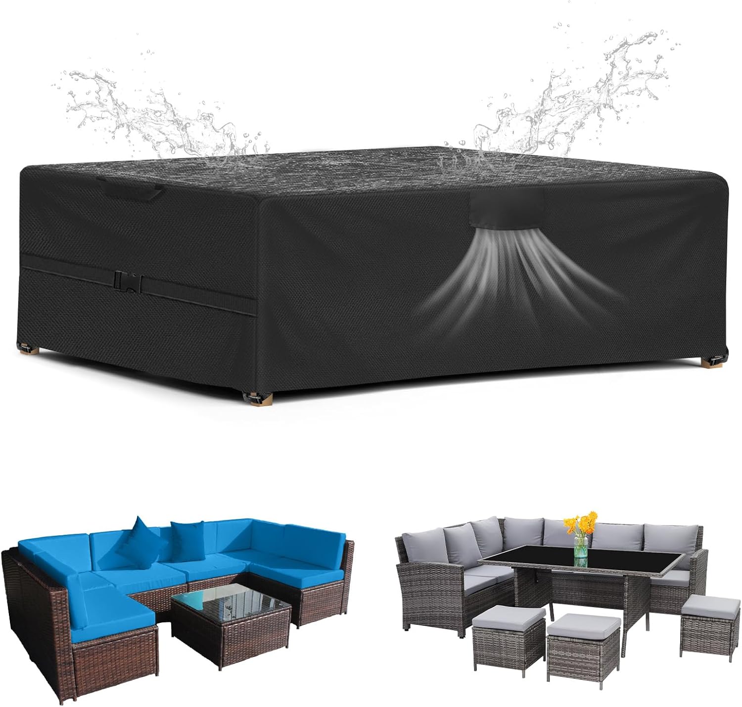 Secondo la descrizione, il tessuto è impermeabile e sulle cuciture viene aggiunto un nastro impermeabile per aiutare a prevenire perdite. In più, la copertura è pensata per proteggere da pioggia, polvere, neve e raggi UV, riducendo lo scolorimento che spesso si vede quando i mobili restano esposti a lungo durante l’estate.