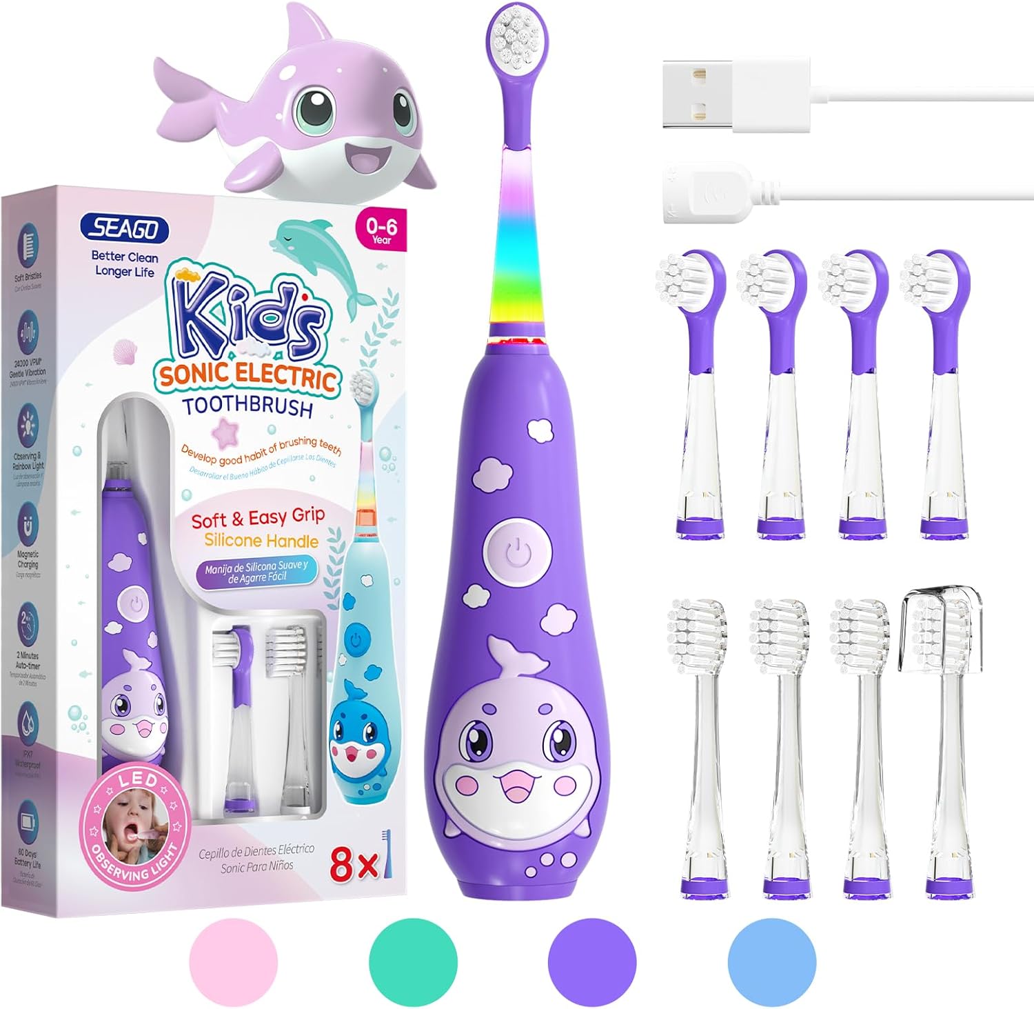 - Seago SG-2159 spazzolino elettrico per bambini (0-6 anni) ricaricabile con 8 testine morbide, LED colorati e timer 2 minuti