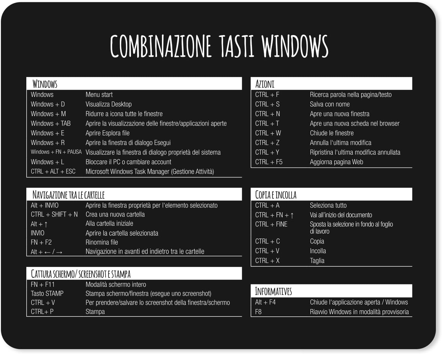 Tappetino per mouse con scorciatoie da tastiera in italiano 24 x 19 cm antiscivolo