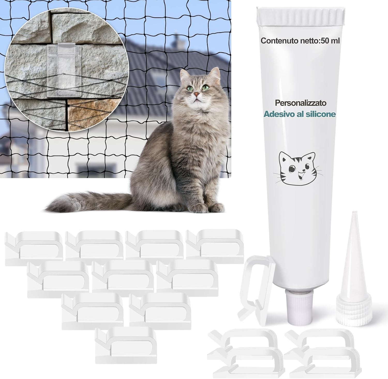 Il kit ThomP unisce ganci adesivi e una colla in silicone extra forte sviluppata per l’abbinamento con i ganci della rete per gatti. Nella descrizione si parla di resistenza in più stagioni (primavera, estate, autunno e inverno), quindi l’idea è che non sia pensato solo per un periodo breve.