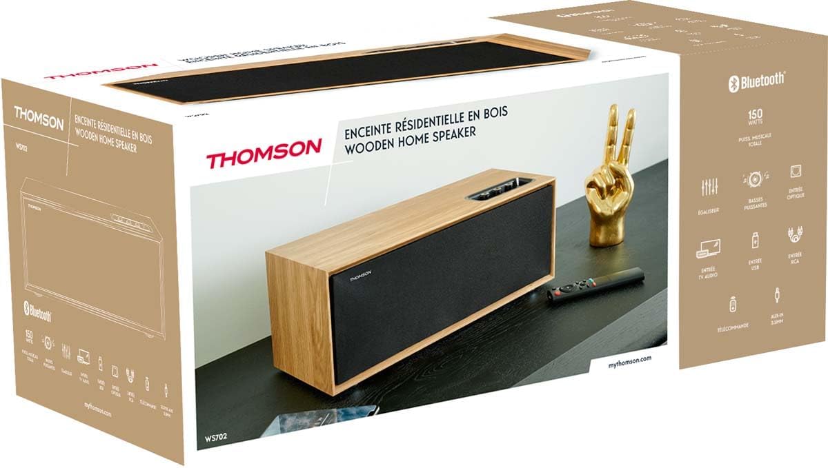 La THOMSON WS702 è una cassa residenziale in legno pensata per portare audio da TV e dispositivi esterni in modo semplice. Sulla carta punta su tre cose: connettività Bluetooth 5.0, una potenza audio musicale dichiarata di 150 W e la presenza di più ingressi (RCA, USB, AUX-in e anche l’ingresso ottico). In più, include telecomando e un equalizzatore con modalità dedicate (musica, film, voce).