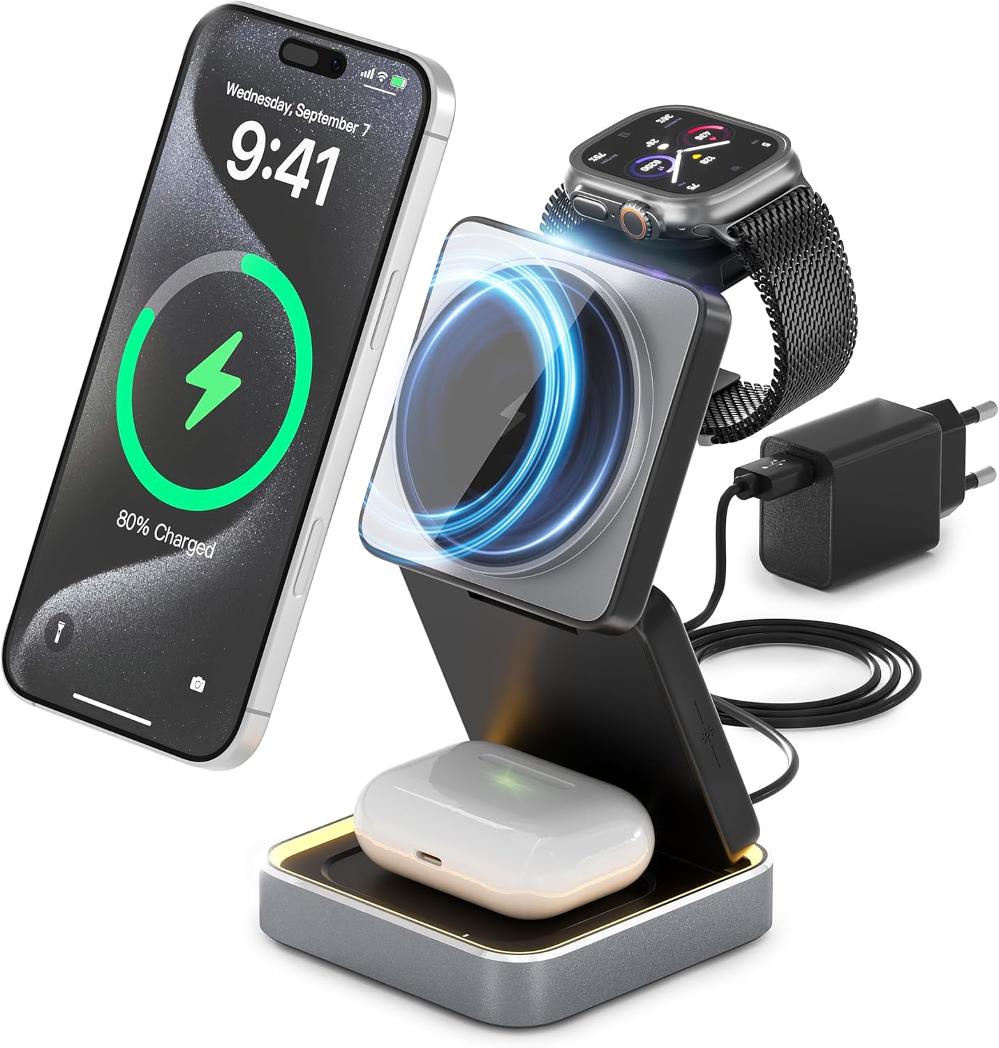 La stazione di ricarica wireless 3 in 1 di Tigratigro è progettata per chi desidera alimentare contemporaneamente iPhone, Apple Watch e AirPods in un unico accessorio compatto. Si presenta come una soluzione pratica per l’uso quotidiano, utile sia a casa sia in ufficio, con la possibilità di richiudersi per occupare meno spazio nello zaino o nella borsa.