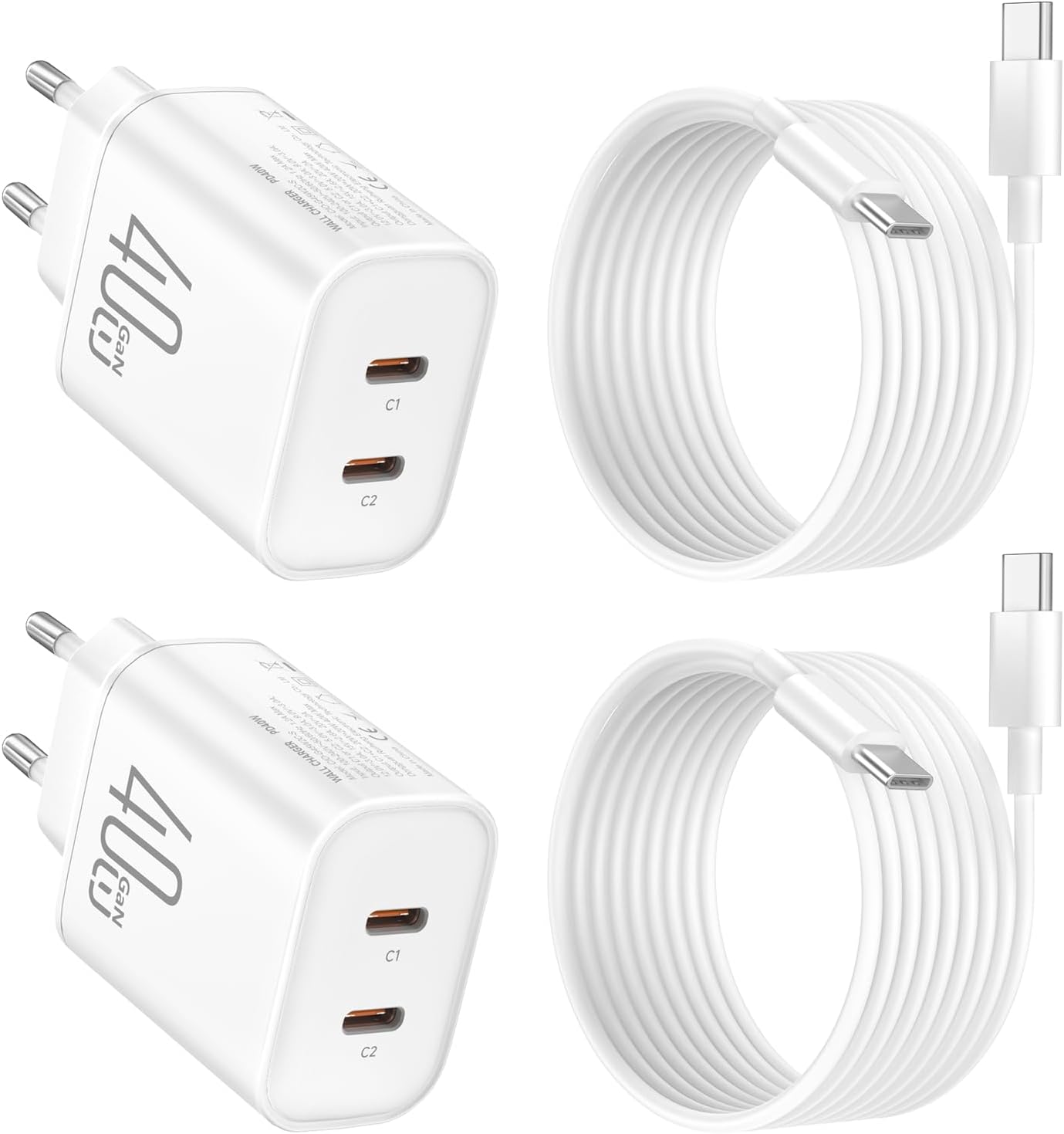 Dal testo base risulta un kit con 2 caricatore USB-C doppia porta da 40W e 2 cavi USB-C da 1,8 m, più uno spazio di stoccaggio portatile. È presente anche una garanzia di 12 mesi e un supporto clienti dichiarato.