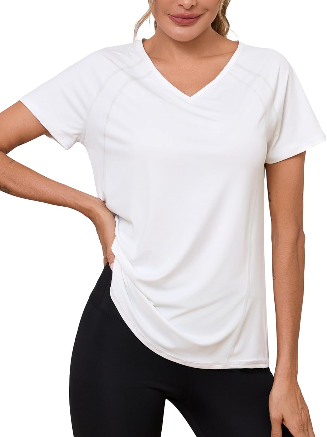 Il taglio con scollo a V e maniche raglan crea una linea semplice ma sportiva. E c’è anche un dettaglio funzionale: nella parte posteriore sono previsti “orifici transpirabili” per aumentare la ventilazione durante l’allenamento. Non è una maglia da “performance estrema” per chi vuole soltanto compressione o tecnologie avanzate, ma per un uso comune tra fitness, yoga, running leggero e attività quotidiana può avere senso.