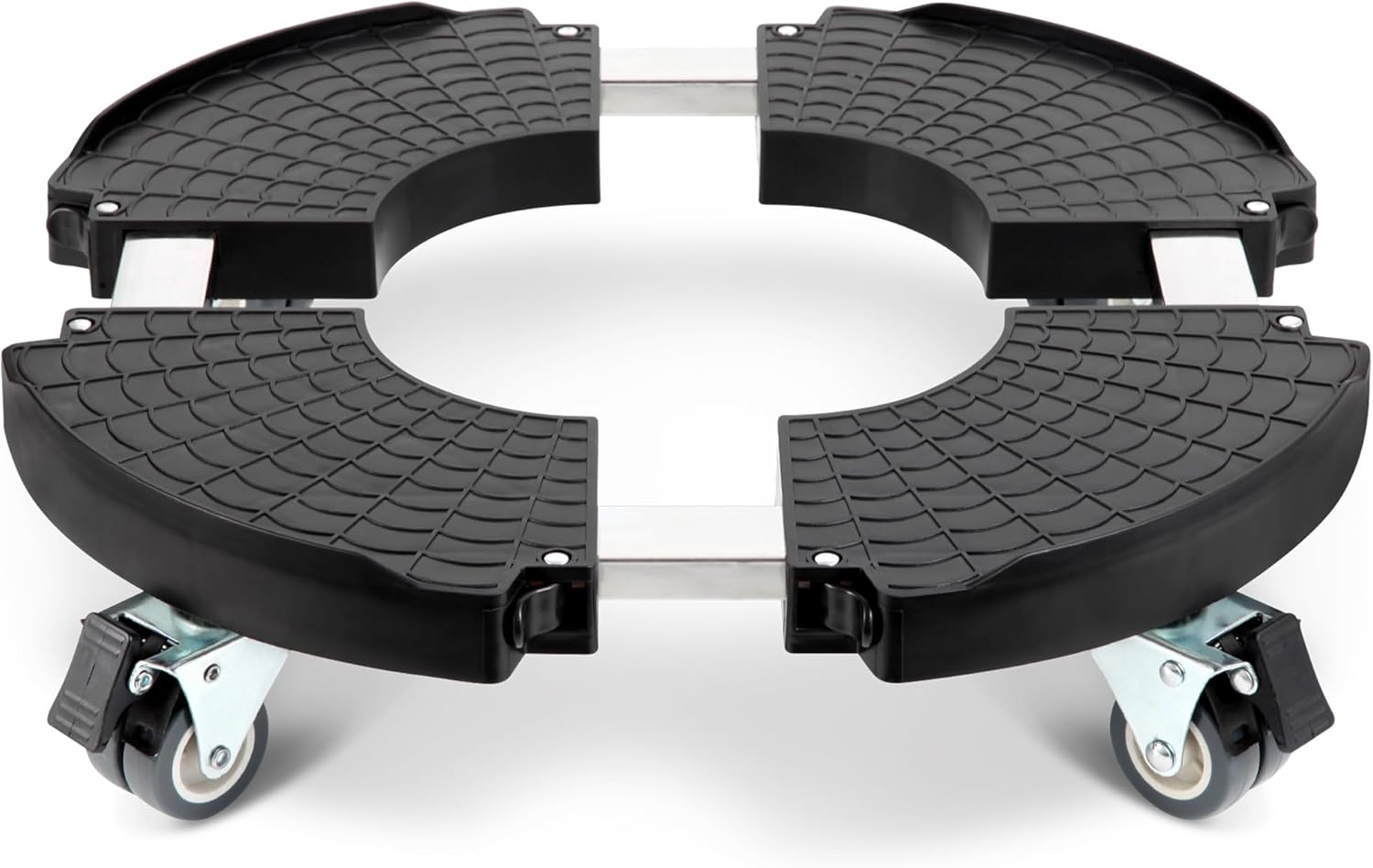 Il carrello/sottovaso è descritto come costruito con pannello in ABS e tubi in acciaio inox, con ruote gemellate dotate di doppio blocco. In più, la struttura riporta un pattern antiscivolo pensato per aumentare la frizione tra supporto e contenuto.