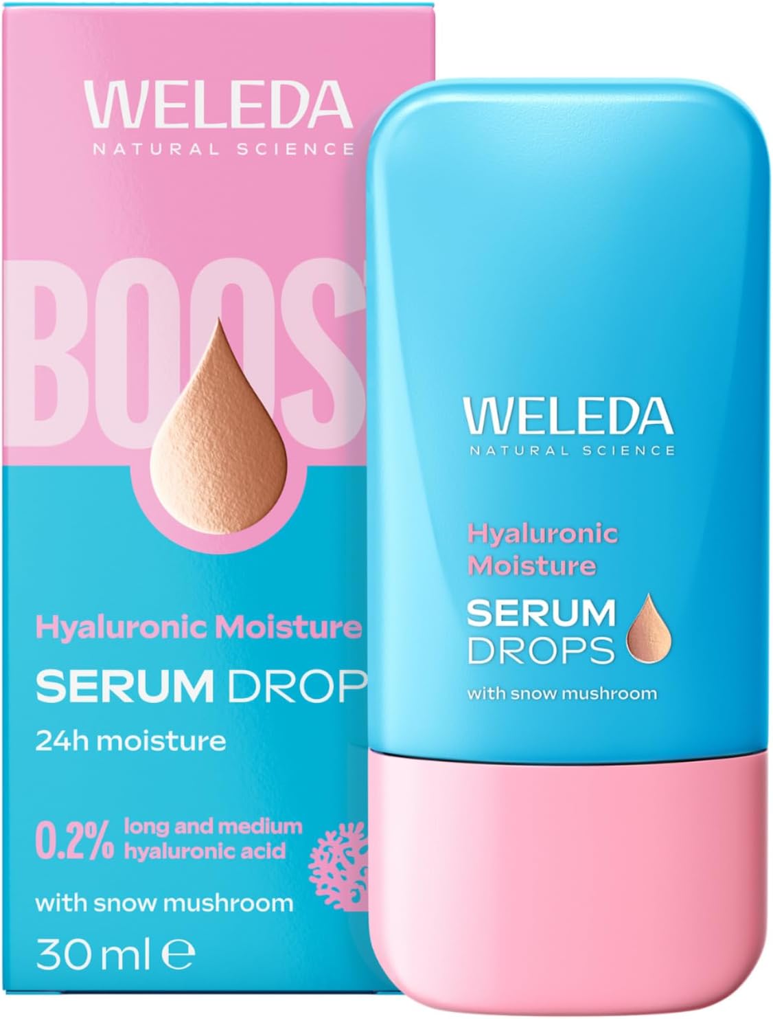 Weleda Siero Acido Ialuronico Boostr Drops è un booster idratante in gel leggero pensato per la pelle secca e stanca. Grazie all’associazione di acido ialuronico (0,2% con catene lunghe e medie) e all’estratto di fungo delle nevi, propone un immediato effetto rimpolpante e rinfrescante, lasciando la pelle più elastica e luminosa.