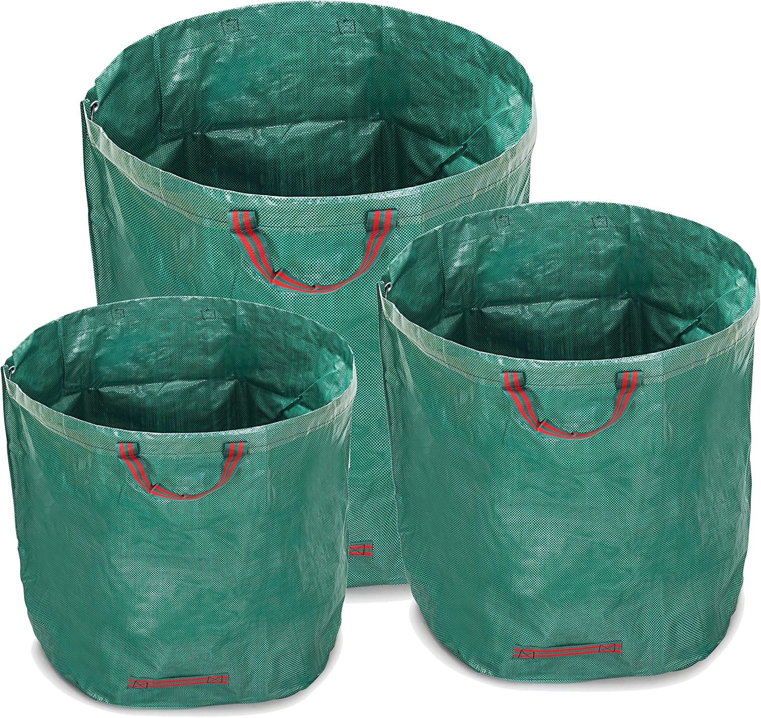 Il vantaggio principale è la formula “pronta all’uso” del set: hai sacchi da 200, 300 e 500 litri, così puoi scegliere la taglia più comoda in base a quanto raccogli. I sacchi sono realizzati in poliestere laminato (spessore indicato: 150 g/m²), con caratteristiche che, sulla carta, aiutano in condizioni tipiche da giardinaggio: antistrappo, stabilizzato ai raggi UV e idrorepellente. In più, la presenza di quattro manici (due sopra e due sotto) rende più agevole il trasporto e la movimentazione anche quando il sacco è pieno.