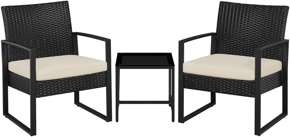 Yaheetech Set mobili da giardino in poly rattan con 2 sedie e tavolino da balcone, con cuscini (interno nero/beige)