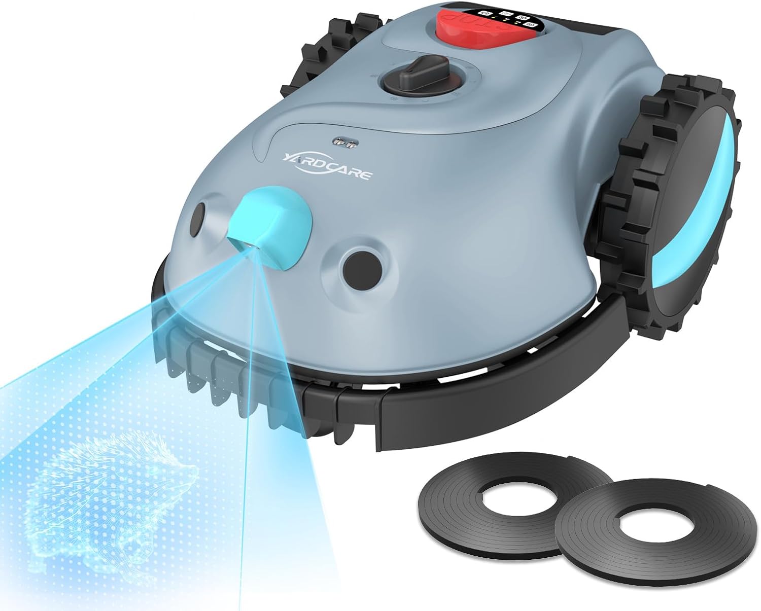 YARDCARE dichiara diverse funzioni di sicurezza: un sensore di inclinazione che ferma immediatamente le lame se il robot viene sollevato, un interruttore di arresto di emergenza per bloccarlo rapidamente in caso di necessità e un sensore di pioggia che dovrebbe portare a fermare automaticamente il funzionamento quando piove.