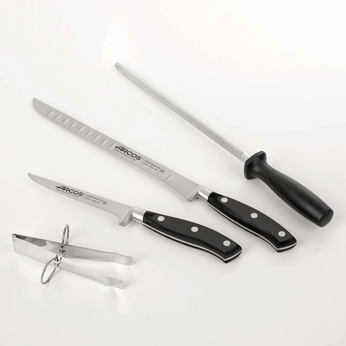La hoja del jamonero y la del deshuesador están forjadas en acero inoxidable Arcos Nitrum, material que aporta dureza superior y mayor durabilidad. El mango de polioximetileno en ambos cuchillos facilita el agarre y resiste el uso continuado. La chaira, de acero al carbono, permite recuperar el filo de forma más eficaz que una chaira de acero inoxidable en ciertos usos. La pinza de acero inoxidable ayuda a manipular las lonchas sin tocarlas directamente, manteniendo higiene y control.