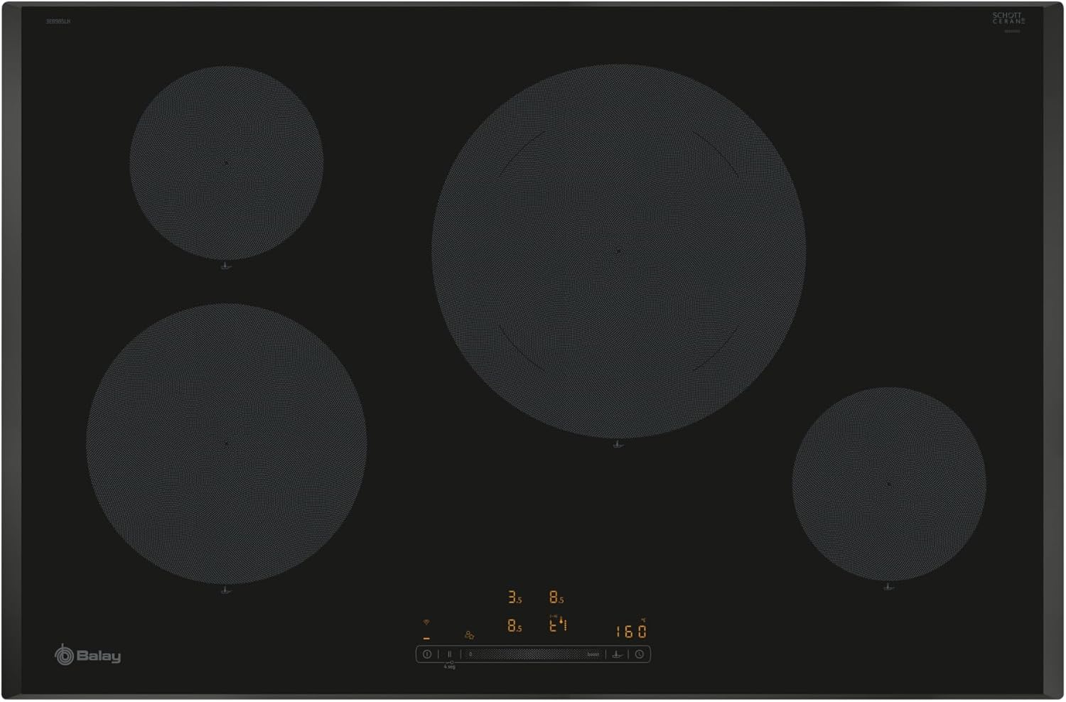 Este modelo de Balay es una placa de inducción de 80 cm con cuatro zonas de cocción diseñada para cocinar con rapidez y control. Ofrece una zona gigante de 28 cm que facilita el uso de cacerolas amplias y ollas grandes, además de dos zonas medianas y otra grande para mayor versatilidad. El control de temperatura del aceite permite ver la temperatura exacta en el display según fabricante, útil para freír con mayor precisión y reducir riesgos de quemado.