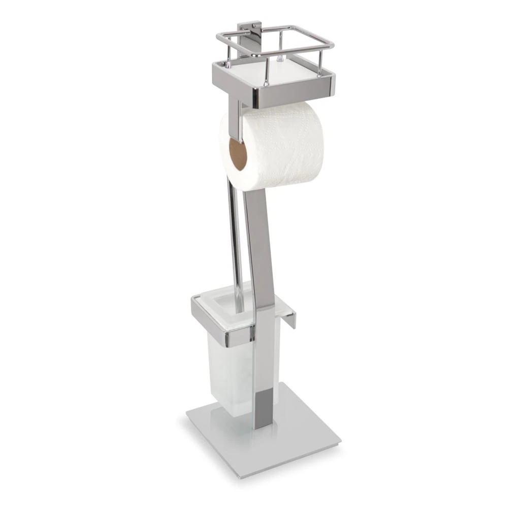 - Diseño minimalista de inspiración italiana que concentra tres funciones en una sola pieza: escobillero, portarrollos y balda superior.