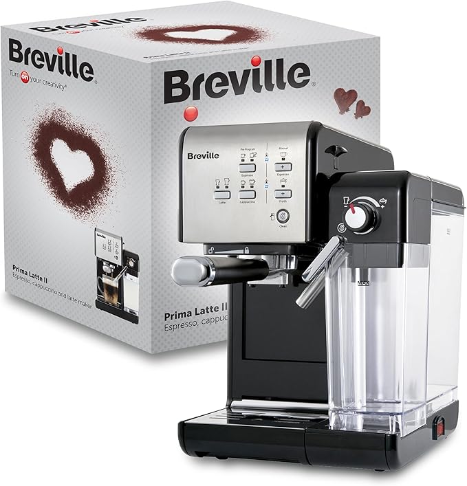 La Breville Prima Latte II Espresso ☕ es una cafetera diseñada para quienes buscan preparar cafés de calidad de barista en casa. Cuenta con una bomba italiana de 15 bares ⚡ que asegura la presión perfecta para extraer sabores intensos y aromáticos en cada taza.
