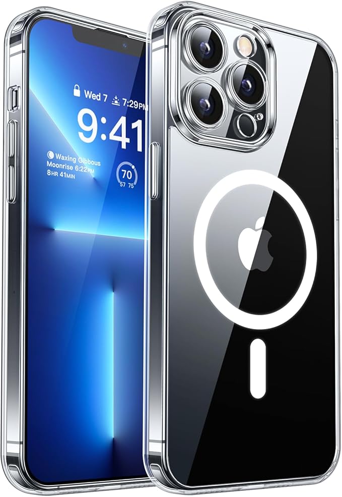 Funda Magnética MagSafe para iPhone 13 Pro Max de CANSHN, diseñada para protección avanzada y conectividad sin esfuerzo, ideal para cargar con MagSafe y otros cargadores inalámbricos, ofrece cobertura total de la cámara con borde elevado de 2,5 mm, material TPU reforzado y transparencia duradera en Bayer alemán que evita amarilleo, manteniendo acceso rápido a botones y puertos mientras soporta caídas y golpes con bolsas de aire en las esquinas.
