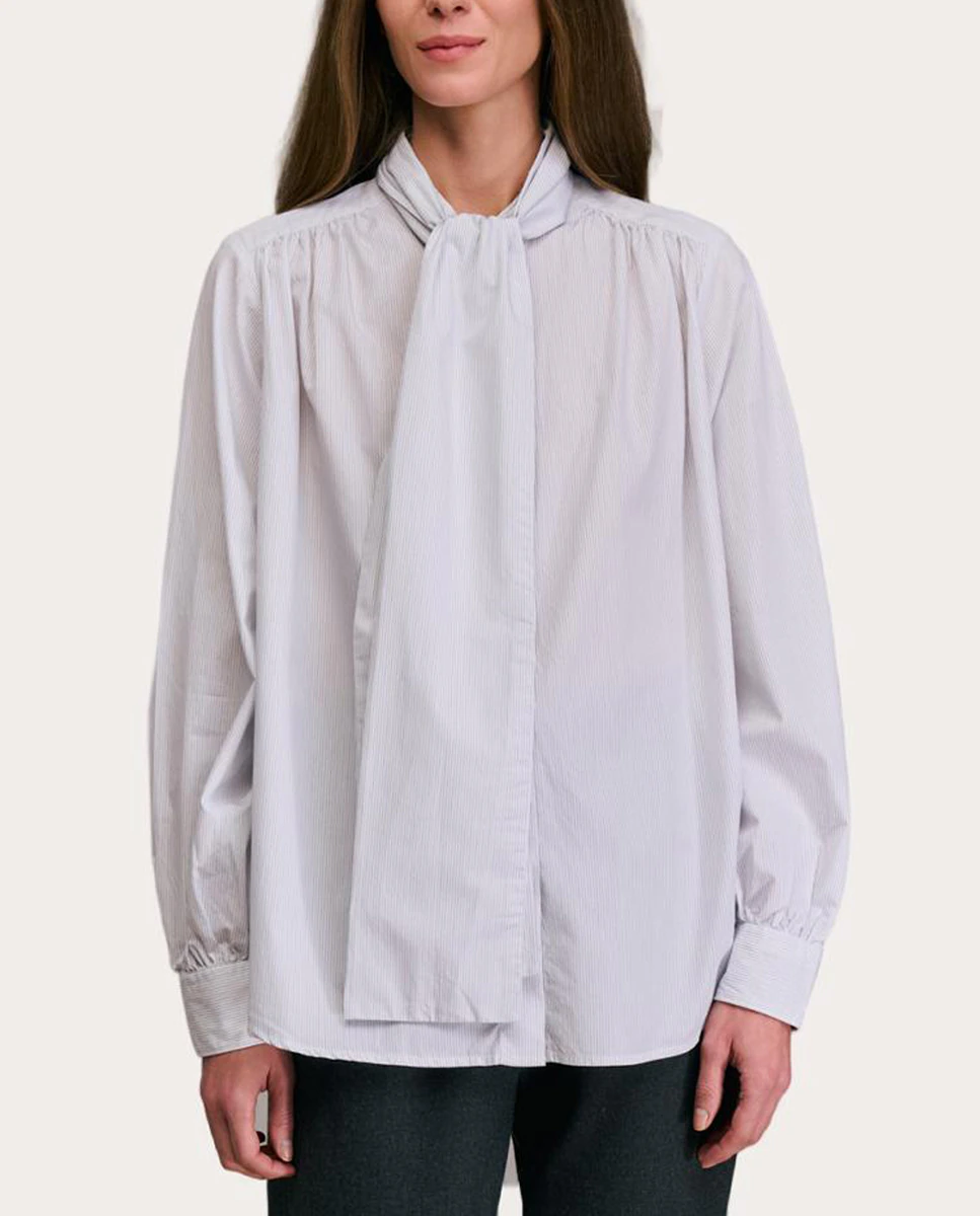 El cuello cerrado con un lazo grande añade un toque distintivo que la diferencia de otras camisas básicas. Las mangas largas están terminadas en puños que se ajustan cómodamente a los brazos, garantizando una apariencia ordenada sin sacrificar libertad de movimiento.