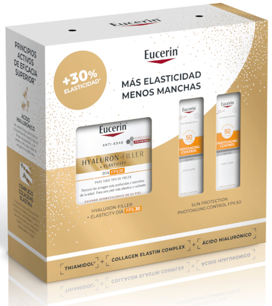 Si tu piel ya empieza a mostrar señales claras de la edad (arrugas más marcadas, falta de elasticidad o manchas que se notan), una crema antiedad de día con protección solar tiene bastante sentido. El pack Eucerin Hyaluron-Filler Elasticity Día FPS 30 (50 ml) + 2 minis Photoaging Control FPS 50+ va por esa línea: combinar cuidado antiedad con fotoprotección desde primera hora, y completar el set con dos minitallas de un protector antiedad de FPS 50+.