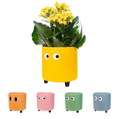 Este macetero amarillo con ojos añade un toque alegre y desenfadado a interiores y exteriores. Tiene patas integradas que elevan la base y ayudan al drenaje y la aireación de la tierra. Su tamaño compacto permite colocarlo en escritorios, estanterías o rincones del salón sin ocupar mucho espacio.