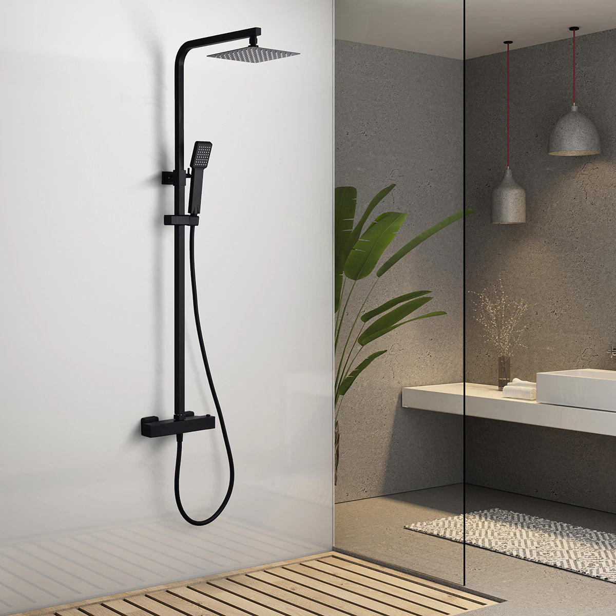 El rociador cuadrado extraplano de 20x20 cm distribuye la lluvia de manera uniforme, reduciendo el riesgo de manchas y aumentando la sensación de spa. La columna cuenta con soporte para mango y flexo reforzado de 1,5 m que garantiza estabilidad.