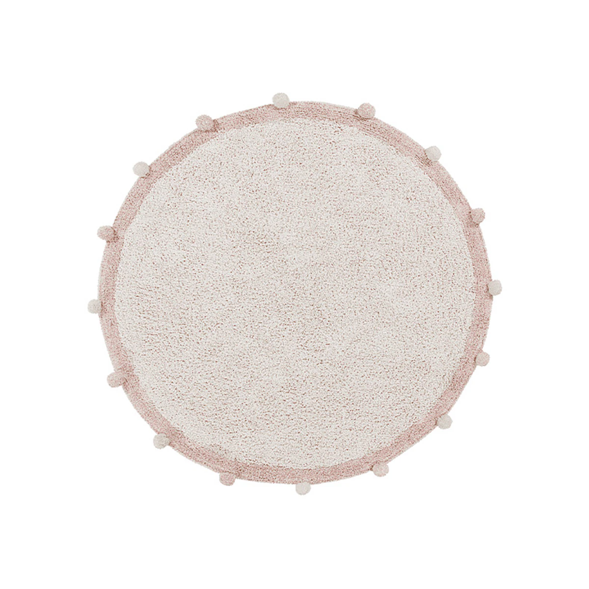 Esta alfombra redonda de algodón combina una base rosa suave con un borde gris y un remate de pompones en tonos gris, blanco y rosa. Aporta textura y un toque cálido al ambiente, especialmente en dormitorios infantiles, salas de estar pequeñas o rincones de lectura. La pieza es lavable, lo que facilita mantenerla limpia tras pequeñas manchas o juegos diarios.