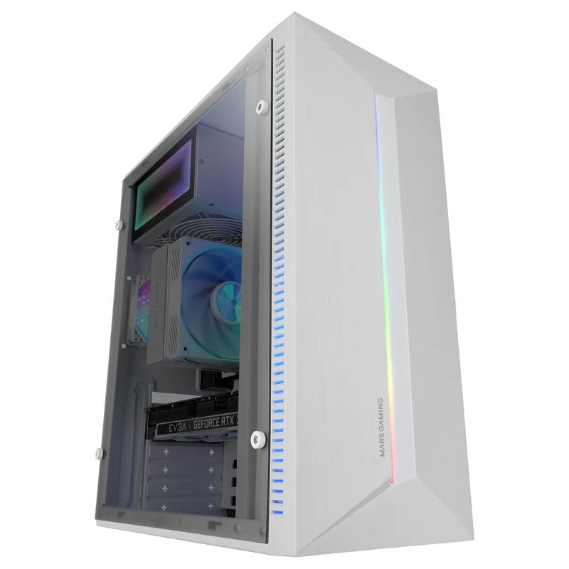 Este chasis Mars Gaming MC-BLAZE combina estética y ventilación para montajes gaming con buena apariencia. Ofrece iluminación frontal con tira LED y ventana lateral completa para mostrar componentes con limpieza y orden. Incluye un ventilador trasero FRGB y una rejilla lateral que facilita la circulación del aire, lo que ayuda a mantener temperaturas más estables en cargas sostenidas.