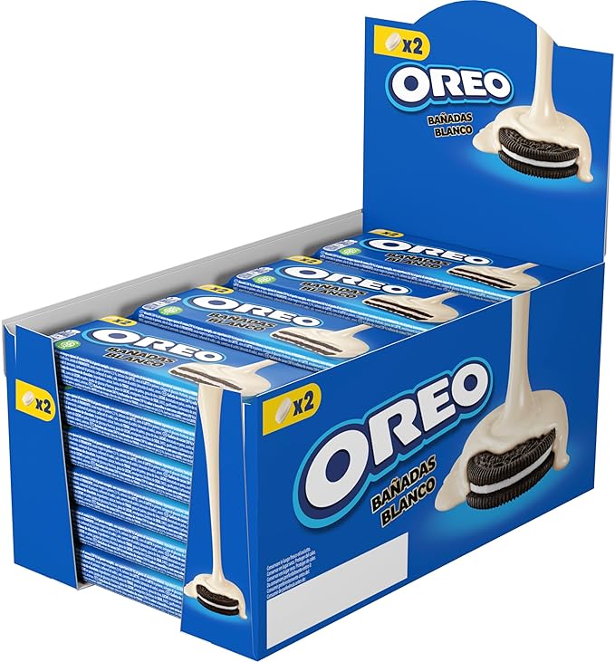 Descubre las irresistibles Oreos Bañadas, un delicioso sándwich de cacao crujiente relleno de suave crema de vainilla, todo bañado en una cremosa cobertura de chocolate blanco.