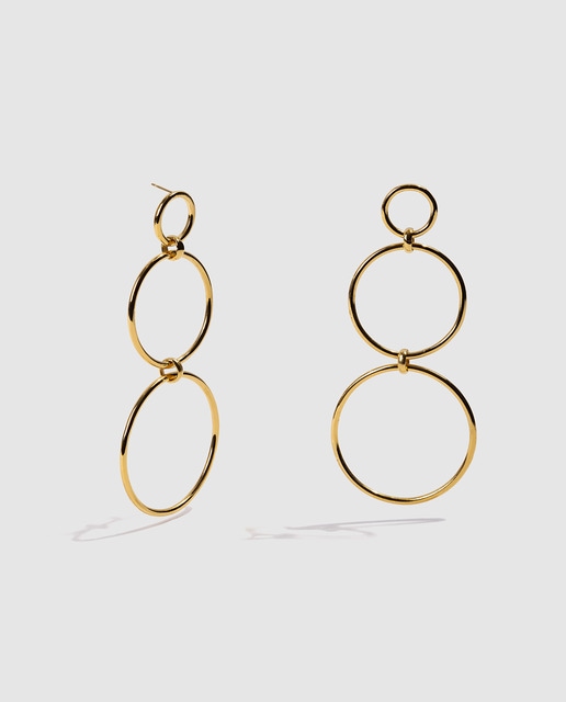 Los aros están formados por tres piezas engarzadas que aportan volumen sin sobrecargar el cuello. Con una longitud de 10 cm y cierre de presión, ofrecen comodidad y seguridad durante todo el día.