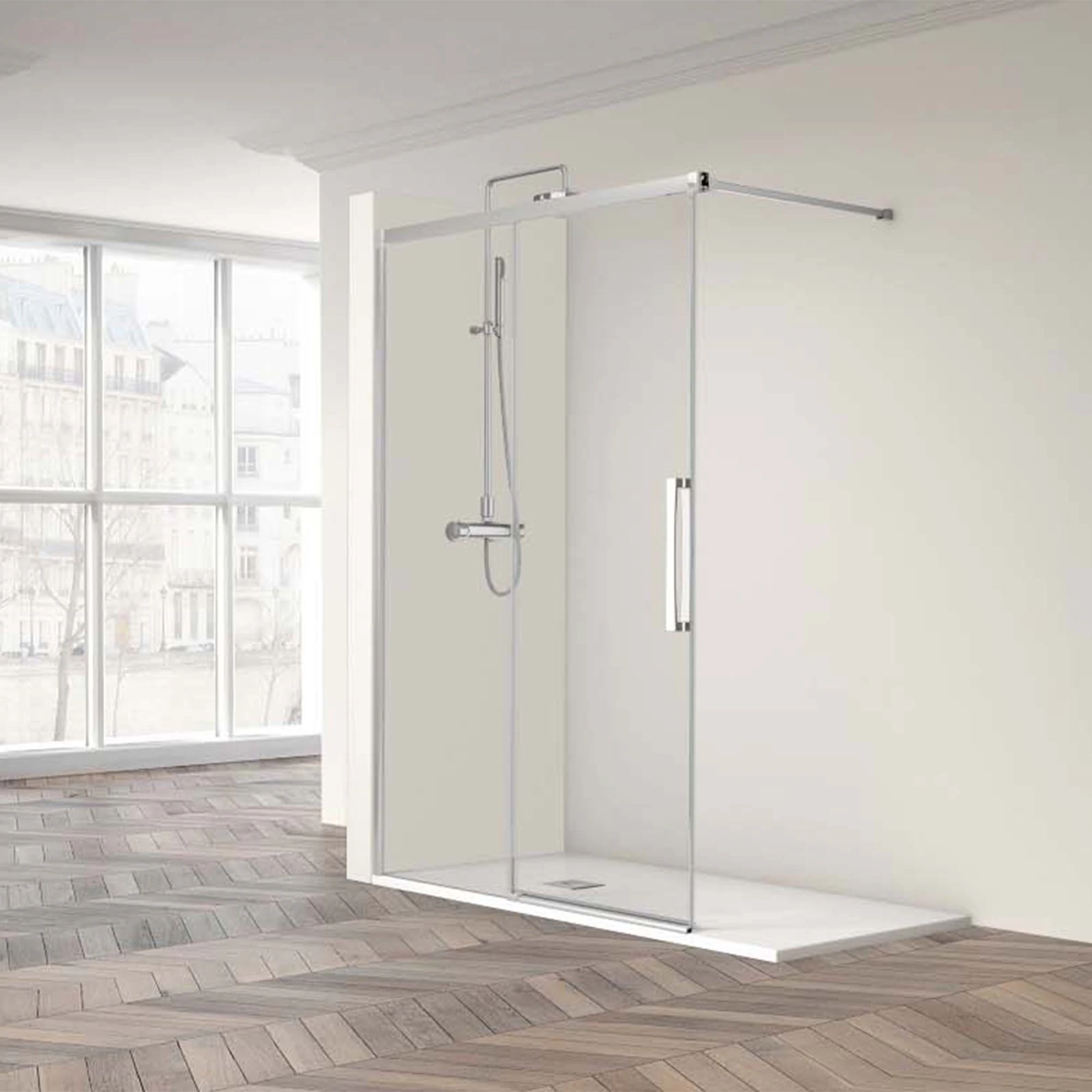 La combinación de panel fijo más puerta corredera facilita el acceso y optimiza el espacio en baños con anchura limitada, manteniendo un diseño moderno y líneas limpias.
