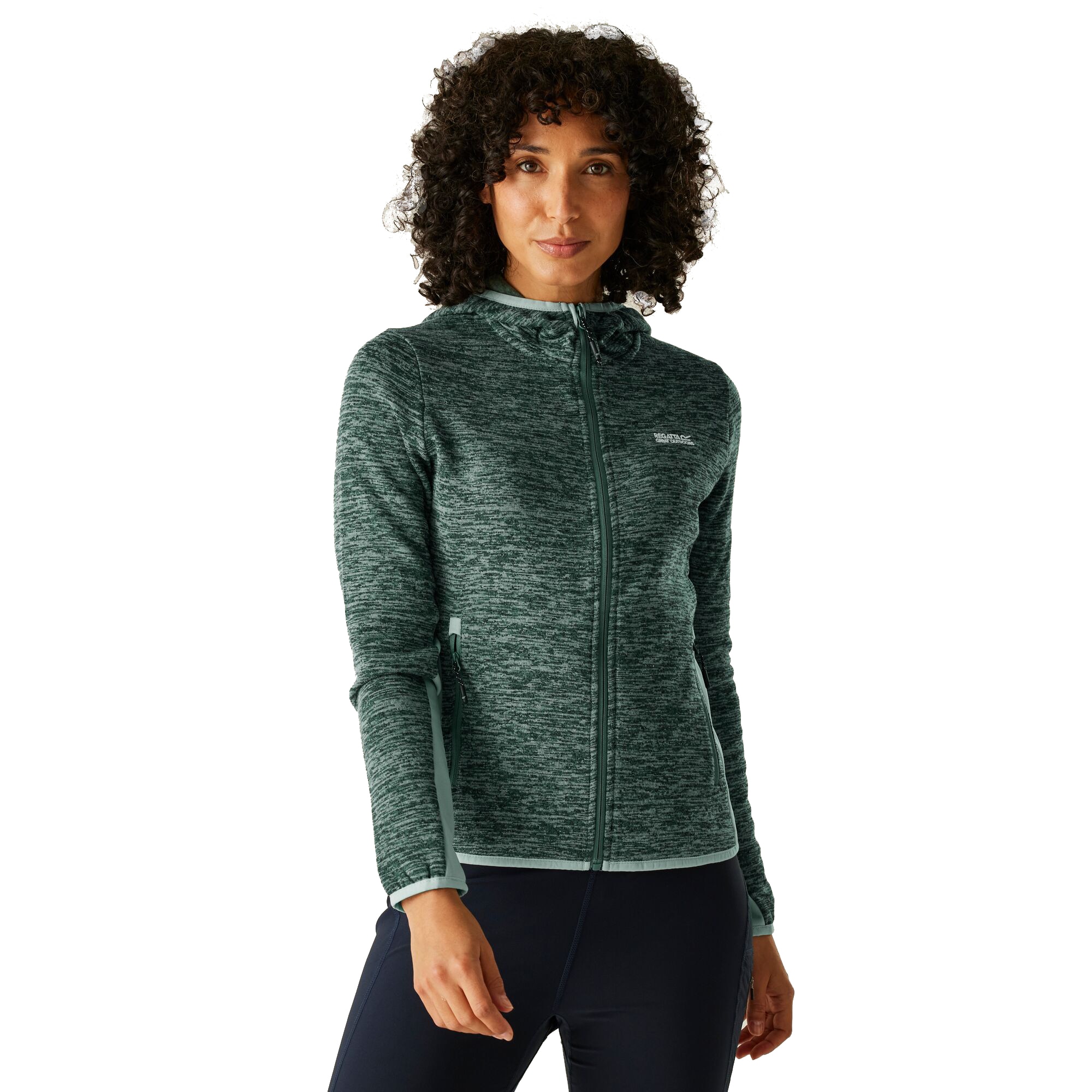 Este forro polar de mujer combina confort y movilidad para actividades al aire libre y uso diario. Su tejido jaspeado aporta un aspecto técnico elegante, y la capucha de una pieza protege sin añadir volumen.