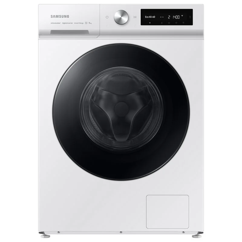 Lavadora Samsung WW11BB744DGWS3 carga frontal de 11 kg que combina tecnología EcoBubble y funciones inteligentes para optimizar el lavado diario en color blanco. Ofrece mayor capacidad interior sin aumentar el tamaño exterior, pensado para familias o quienes necesitan lavar piezas voluminosas con eficiencia energética.