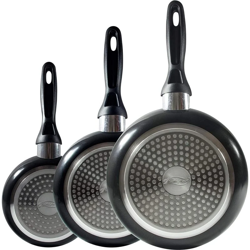 El conjunto incluye tres sartenes de diámetros distintos que cubren la mayoría de necesidades en una cocina doméstica. El exterior negro le da un aspecto sobrio y las piezas son ligeras, lo que facilita manipularlas cuando están llenas. Los mangos ergonómicos con efecto frío aportan seguridad al mover las sartenes durante la cocción. Fondos aptos para todo tipo de fuegos, incluida la inducción, según la ficha técnica.