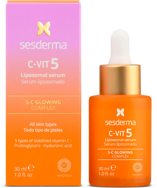 El Sesderma C-Vit 5 Sérum Liposomado de 30 ml es un sérum facial de alta concentración de vitamina C, diseñado para ofrecer un efecto luminoso y antioxidante duradero. Este producto está indicado para pieles fotoenvejecidas, con tono apagado, aspecto cansado y líneas de expresión.