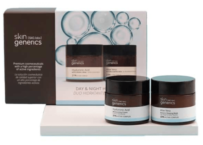 Skin Generics Hydra Duo Day & Night combina dos fórmulas complementarias para hidratar y regenerar la piel del rostro durante el día y la noche. Incluye un gel regenerador nocturno y una crema-gel con ácido hialurónico para uso diario, orientadas a mejorar la hidratación y la elasticidad según fabricante.