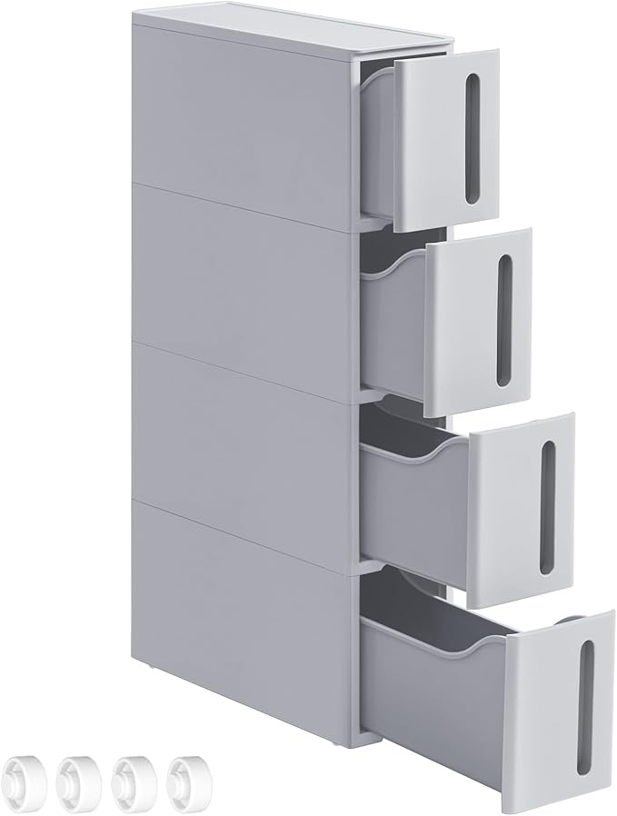 Carrito estrecho SONGMICS con 4 cajones de 10 litros y ruedas, ideal para optimizar espacios reducidos en baños, cocinas o dormitorios, su ancho de 17,3 cm permite aprovechar áreas pequeñas y su estructura en plástico PP ofrece resistencia al agua y facilidad de limpieza, mientras las 4 ruedas facilitan moverlo y el montaje es rápido en unos minutos para mantener ordenado el contenido.
