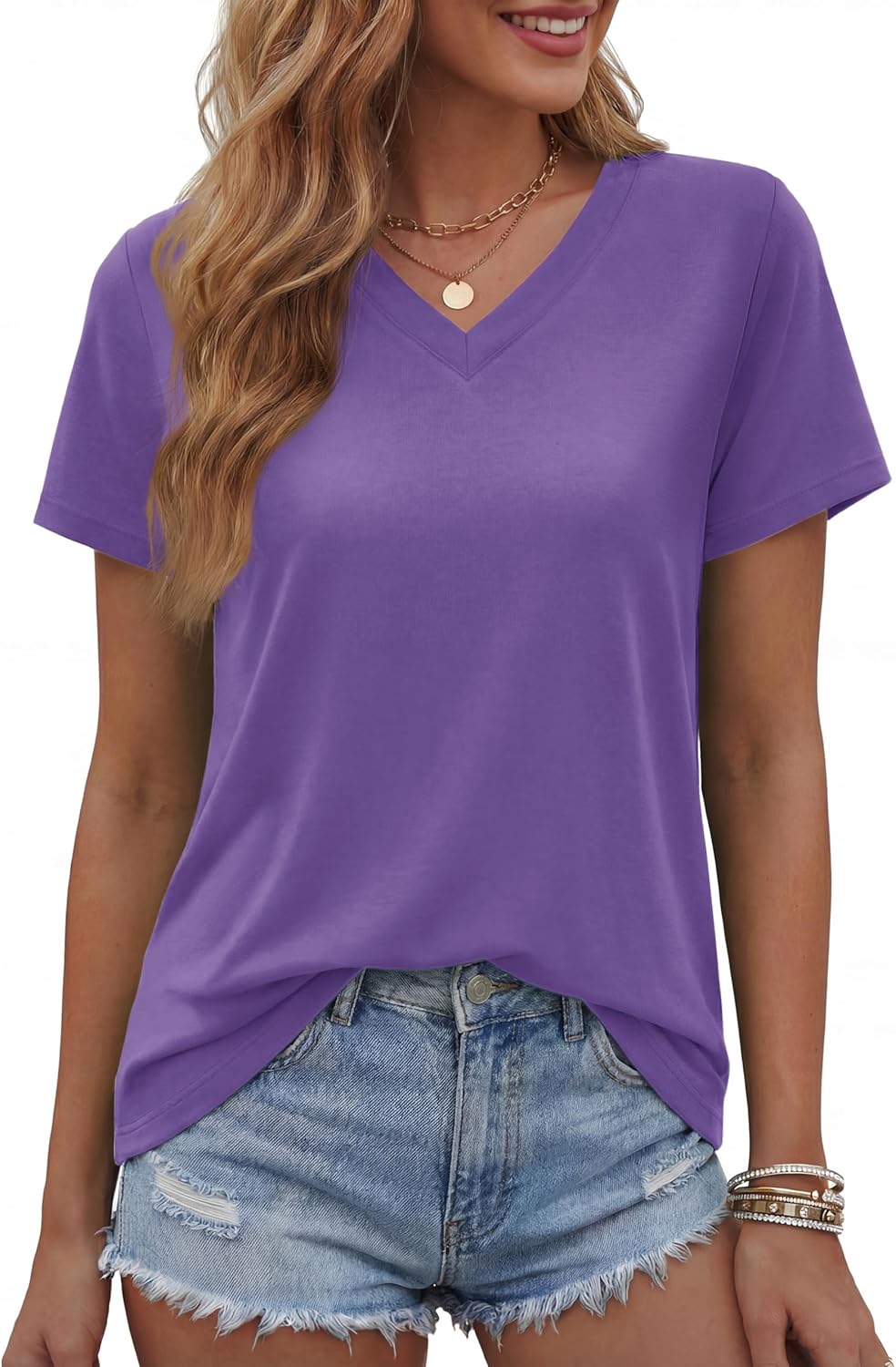 TACVASEN camisetas de algodón de manga corta para mujer con cuello pico (tira de color violeta claro, talla S)