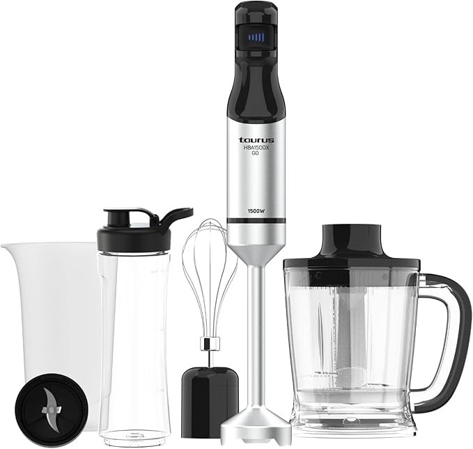 : vaso medidor de 700 ml, picador de 500 ml y emulsionador, ideales para batir, triturar, picar y emulsionar con precisión.