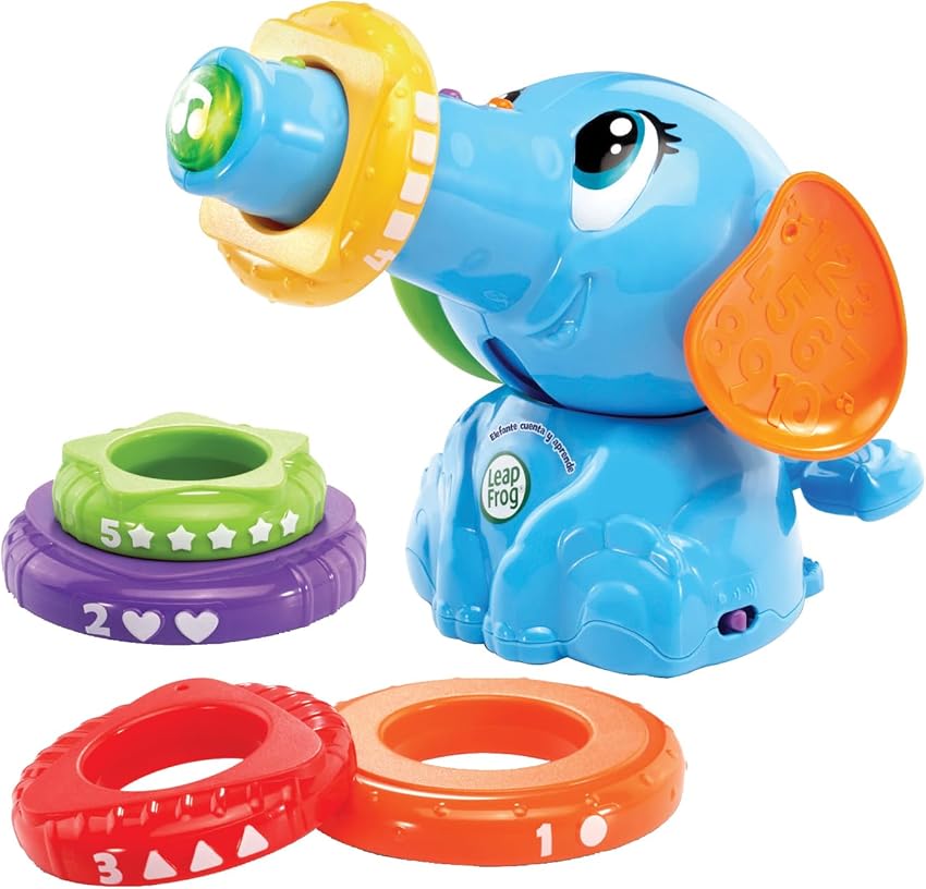 La estructura facilita el encaje y la clasificación de los anillos por tamaño y color, lo que favorece la comprensión de nociones numéricas desde etapas tempranas. Incluye un botón en la trompa que activa canciones en versión española, añadiendo ritmo y repetición para reforzar el reconocimiento de sonidos. Al presionar la cola el elefante estornuda y provoca la caída de los anillos, lo que introduce causa y efecto con un elemento sorpresa que llama la atención del bebé. Las orejas presentan texturas distintas para estimular el tacto y variar la experiencia sensorial. Según el fabricante, el juguete pertenece a la línea LeapFrog y pretende apoyar la confianza y el avance en habilidades básicas.