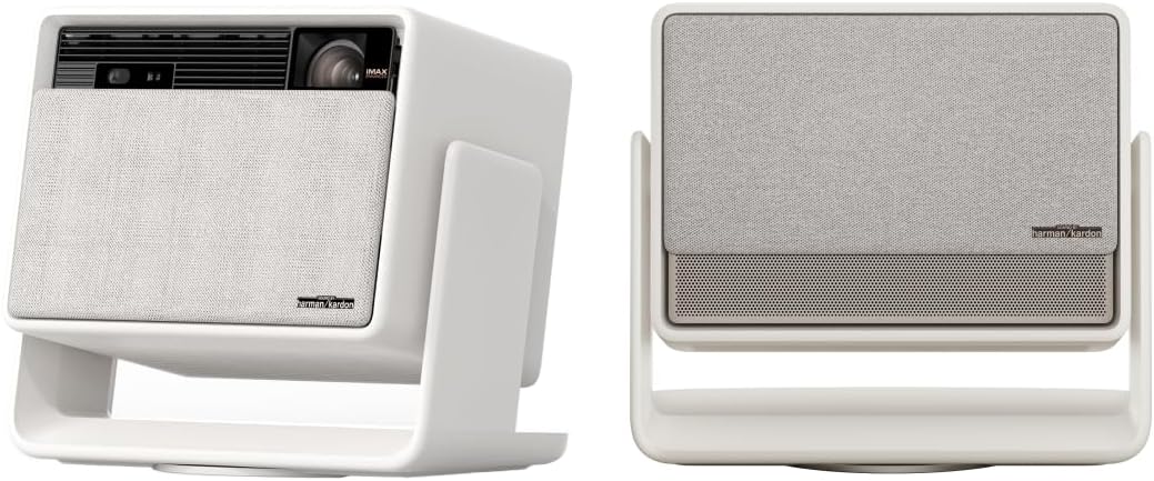 El diseño del proyector es práctico y amigable, con una cubierta deslizante eléctrica en tejido de lana que da un toque elegante y permite proteger la lente cuando no está en uso ✨. También cuenta con certificaciones para reducir la luz azul, la dispersión de color y la separación de colores, promoviendo una visualización más cómoda para los ojos.