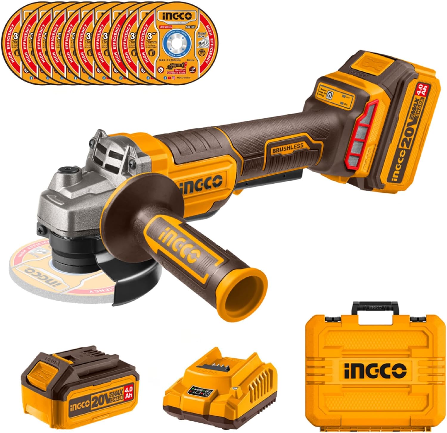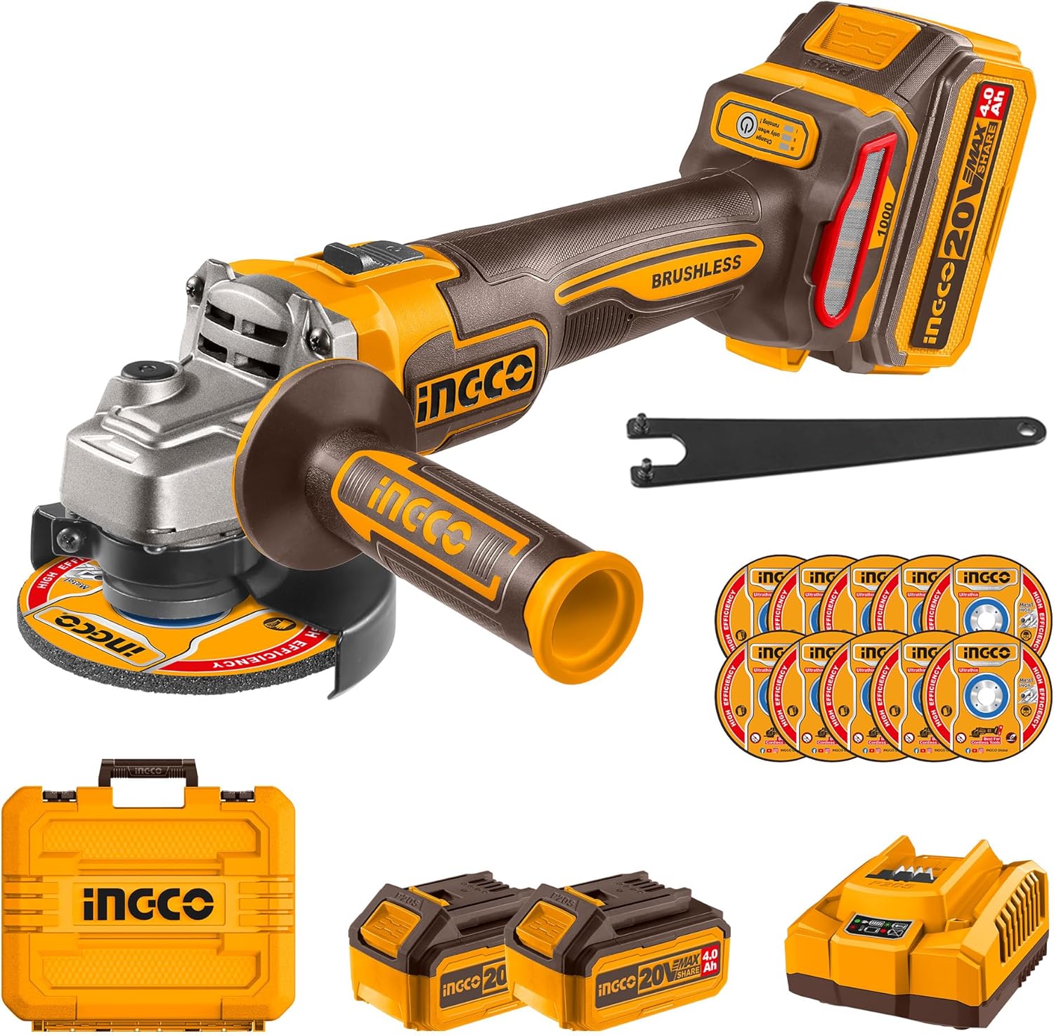 INGCO 20V Cordless Angle Grinder 115mm (Brushless) with Safety Trigger Switch, 4.0Ah Battery & Charger, CAGLI2111561