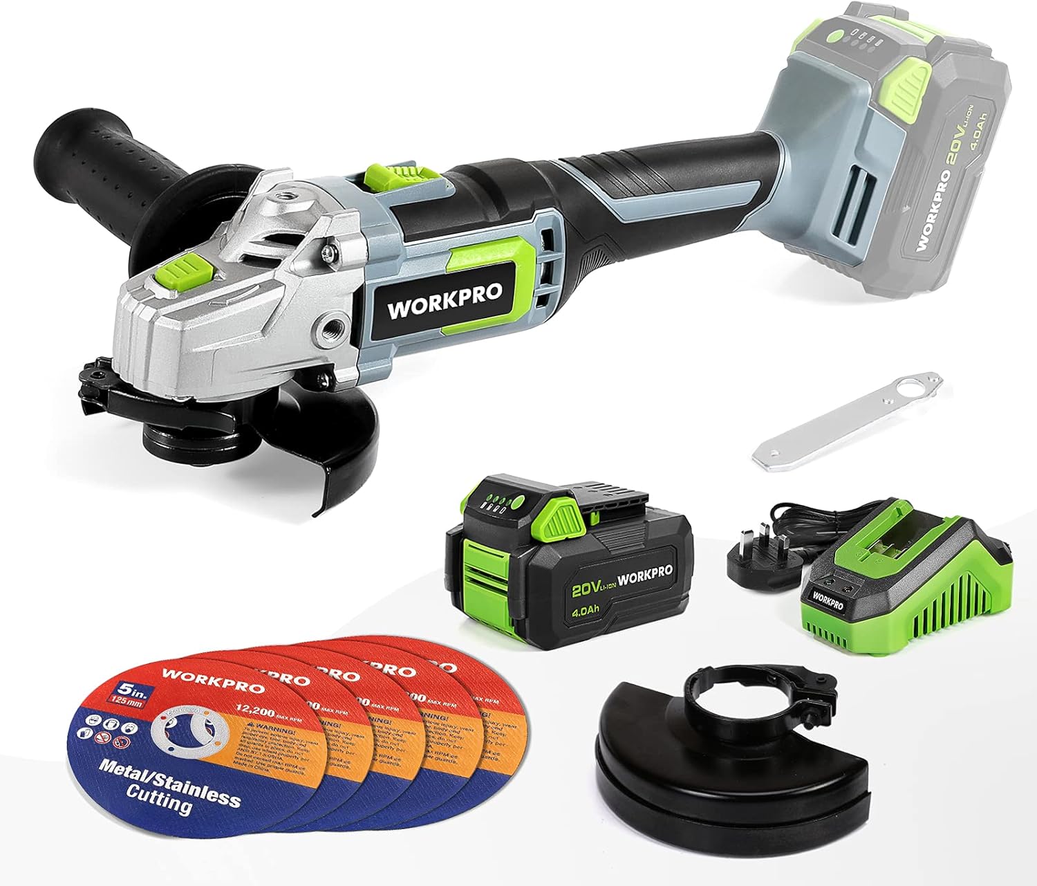 WORKPRO 20V Cordless Angle Grinder (125 mm) with 4.0Ah battery, fast charger and 5 cutting wheels
