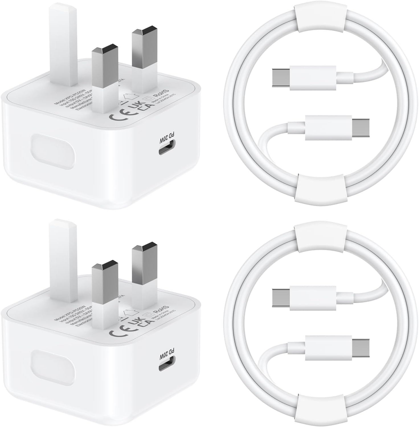 Two 20W USB‑C power adapters and two 6FT MFi certified USB‑C to USB‑C cables are supplied, each set tested before dispatch for quality assurance.