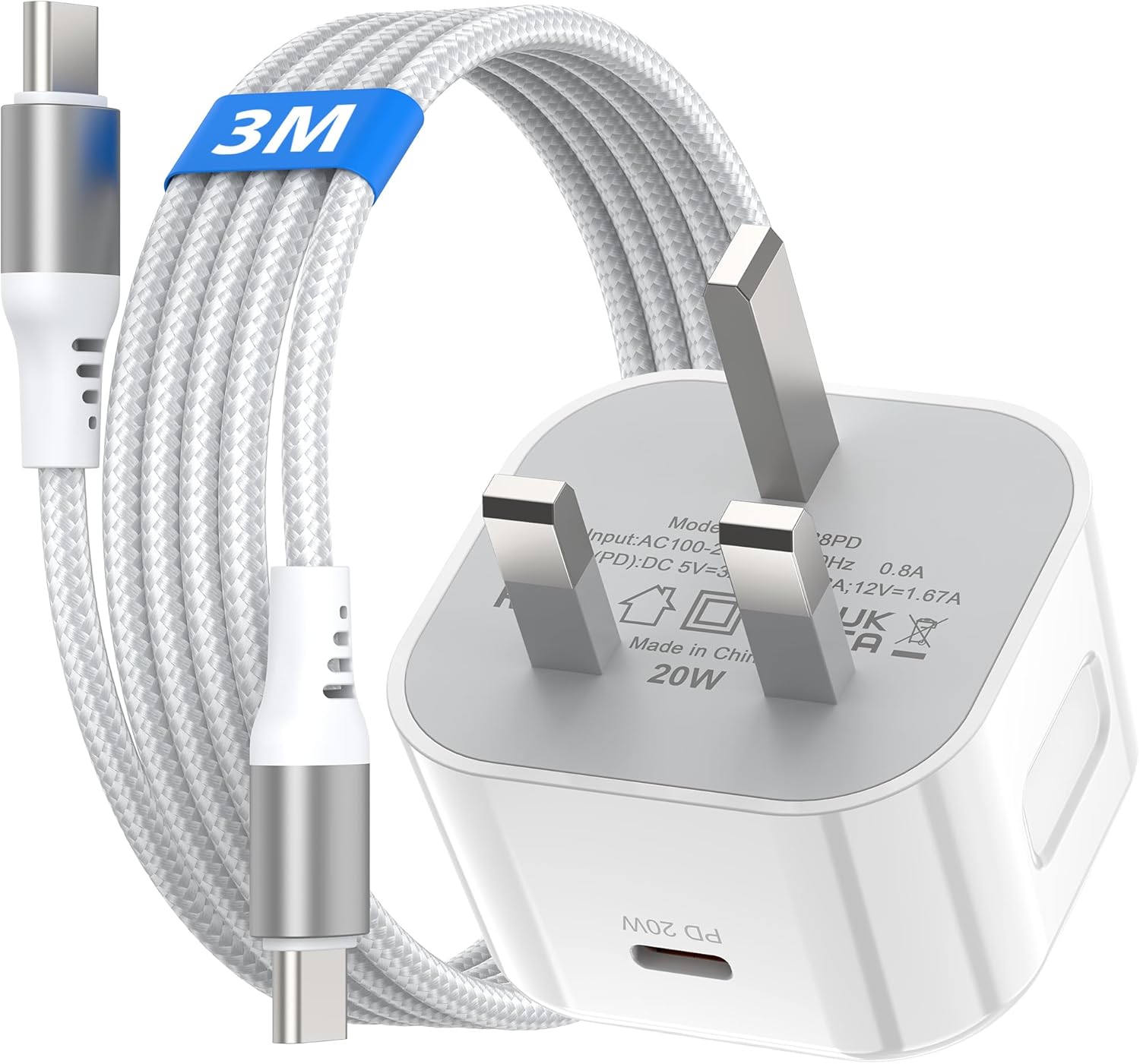 - 20W USB‑C Fast Charger Plug with 3m Nylon USB‑C Cable for iPhone 17/16/15 Pro, Air, and iPad (UK)