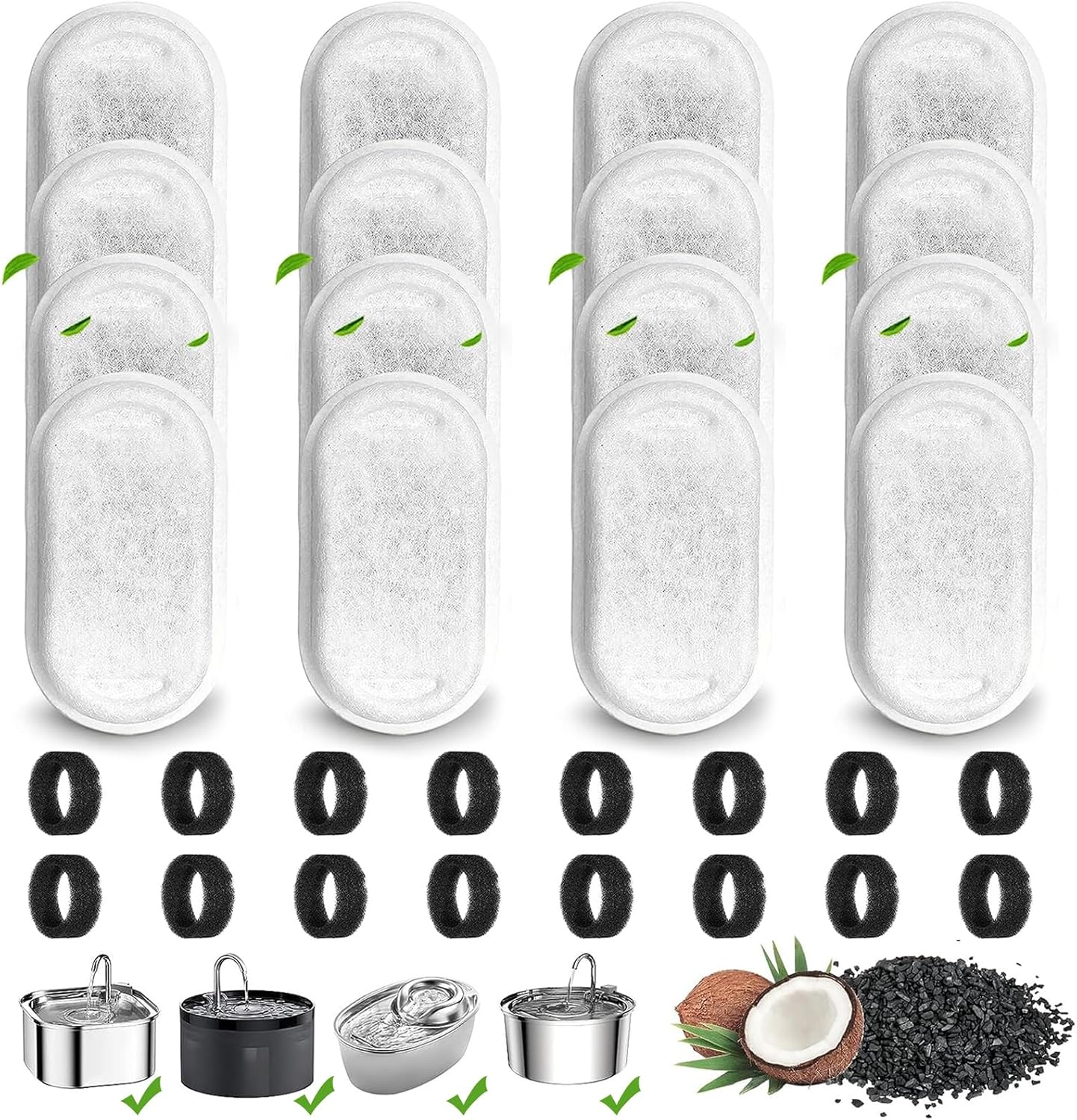 32 PCS Cat Water Fountain Filter Replacement (16 carbon filters + 16 foam sponges) for 108oz/3.2L and 67oz/2L fountains