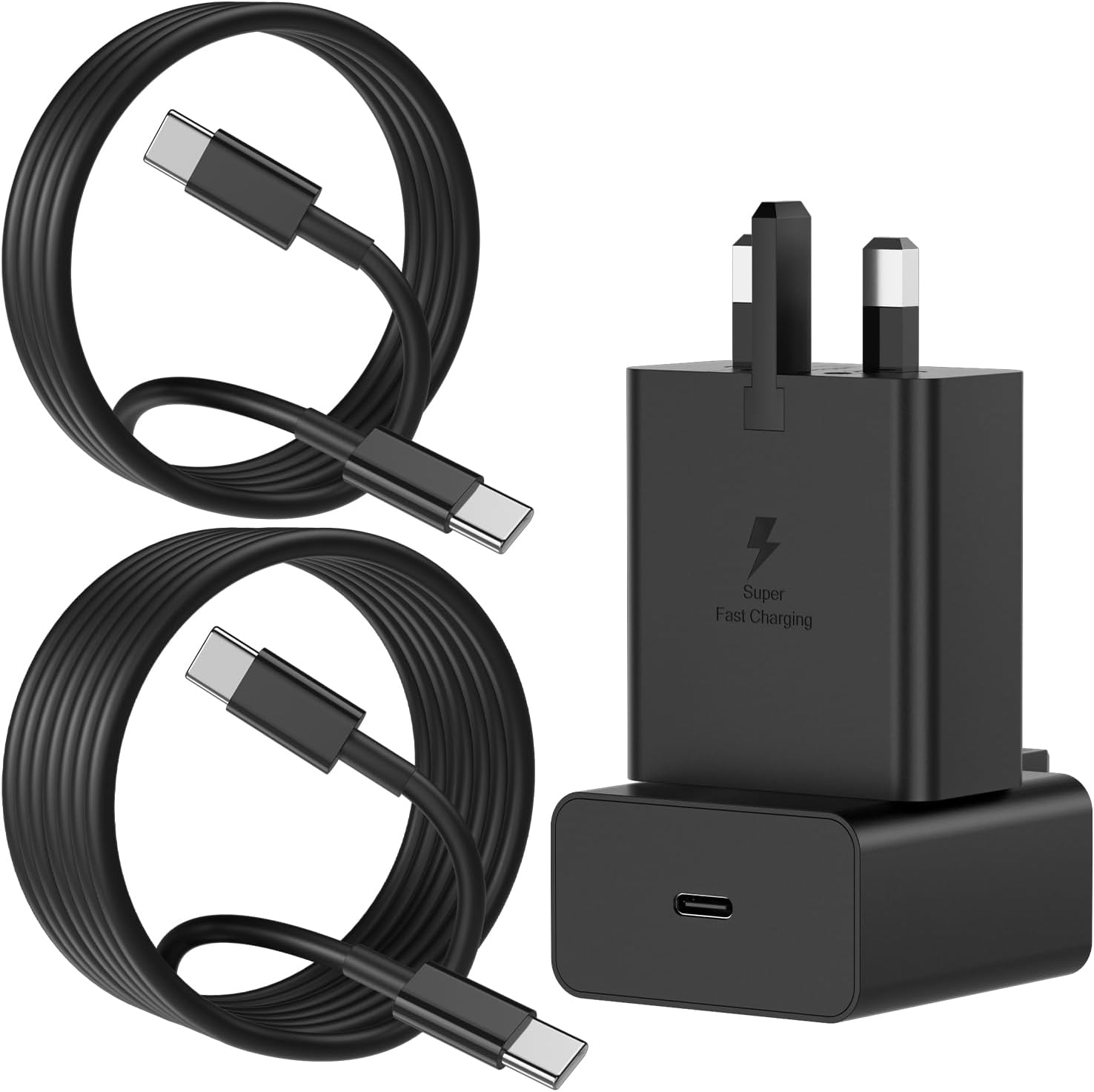 - Included in pack: 2× 45W Samsung Super Fast Charger plugs + 2× USB‑C cables (1m + 2m)