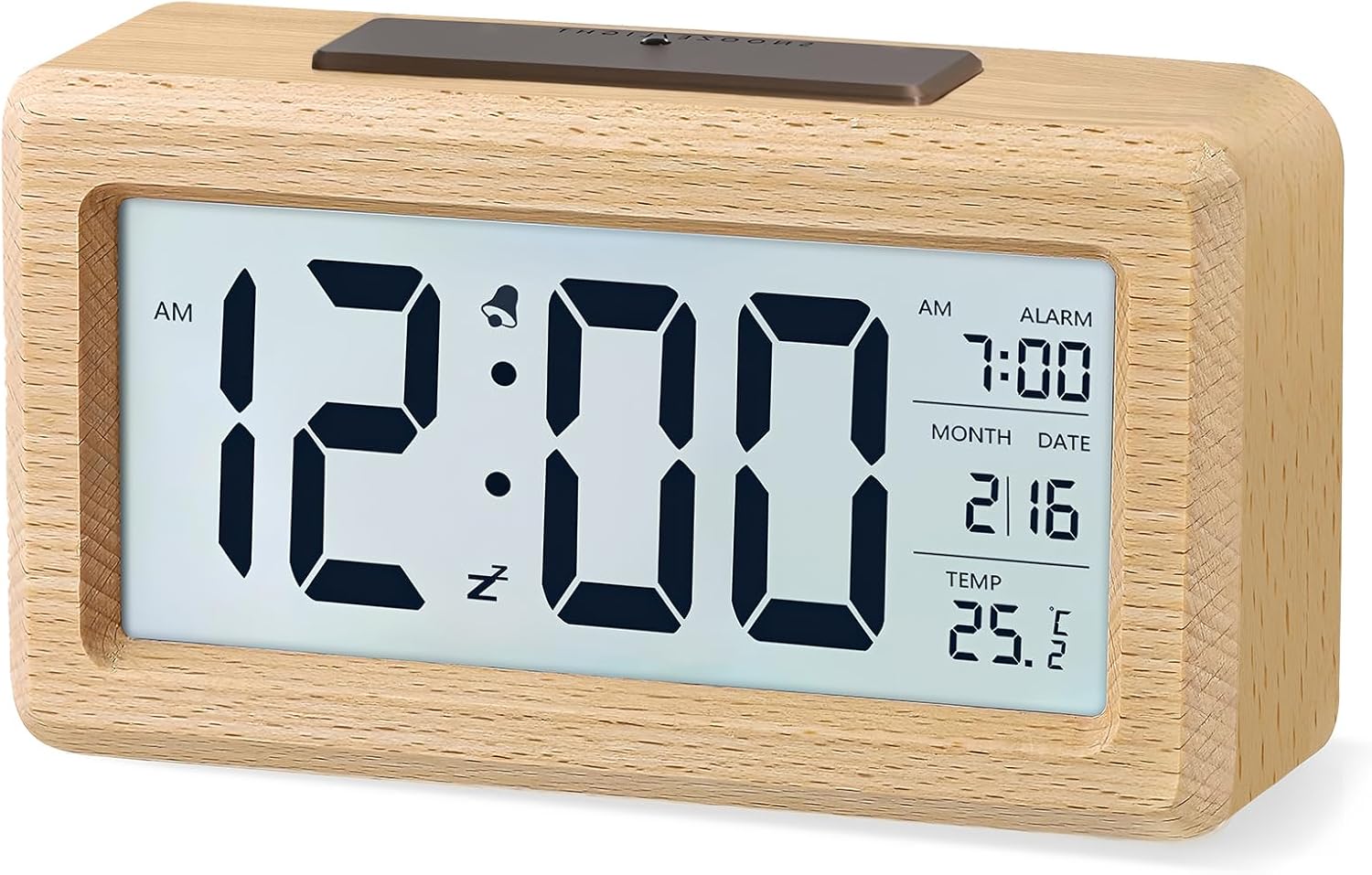 aboveClock Digital Alarm Clock Wooden Bedside Clock with Large Backlit LCD, Temperature & Snooze (AAA batteries needed)
